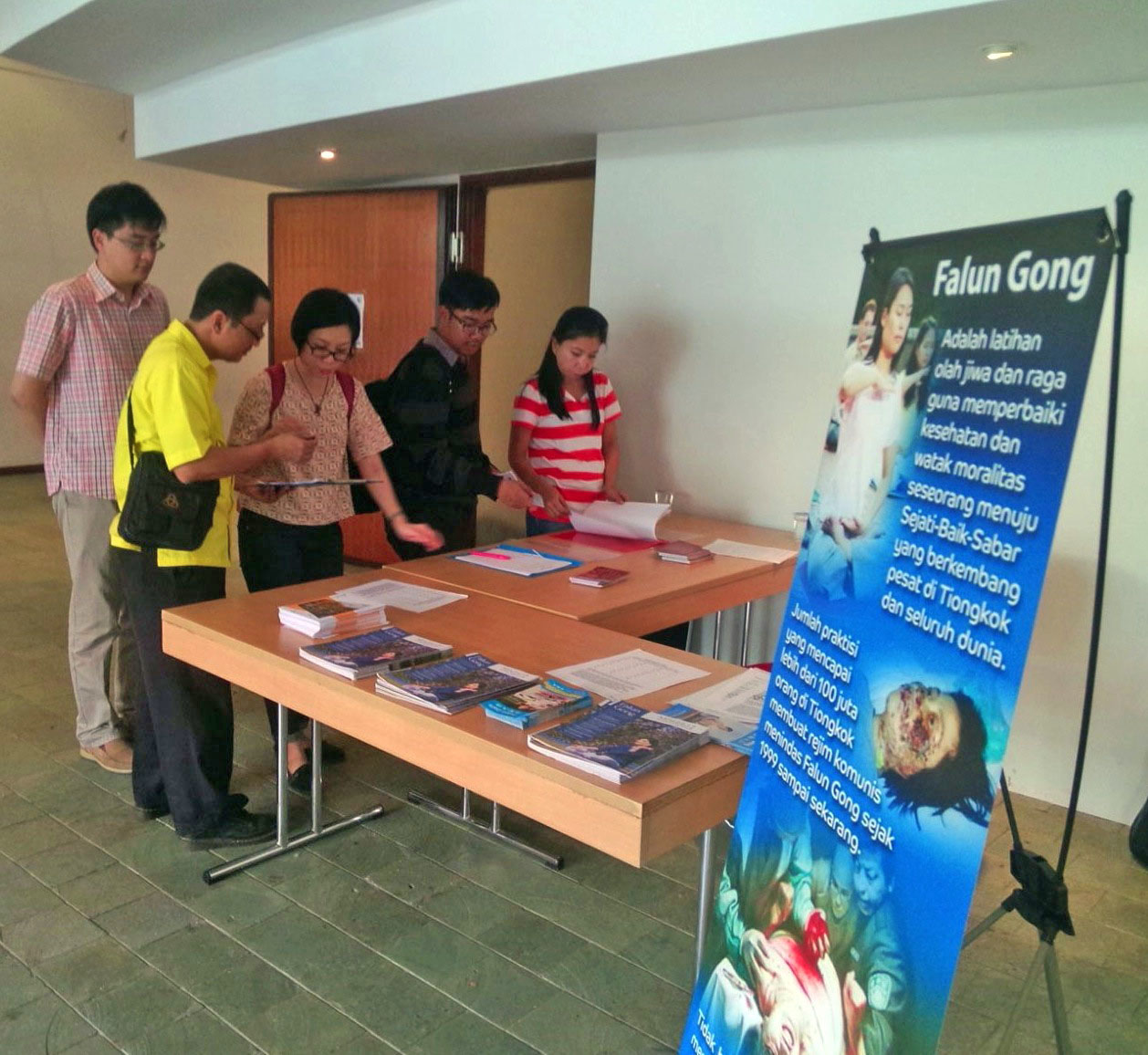 当地的法轮功学员也受邀参加研讨会,主办方还特别提供了一张桌子以便征集签名,很多与会者前来了解在中国大陆这些年来对法轮功的迫害,并且在递送给中国最高检察院和最高法院的举报信上签字。