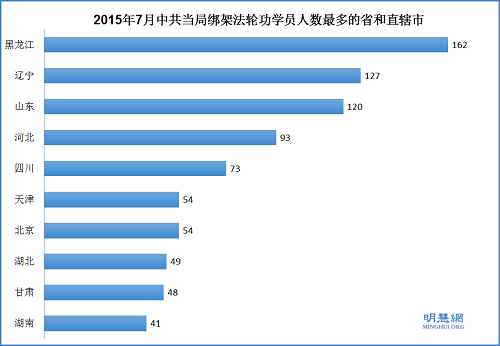 7月份有1187名法轮功学员被绑架,迫害最严重的省份(直辖市)排名前十名依次是:黑龙江162人,辽宁127人,山东120人,河北93人,四川73,北京54人、天津市54人,湖北49,甘肃48,湖南41。