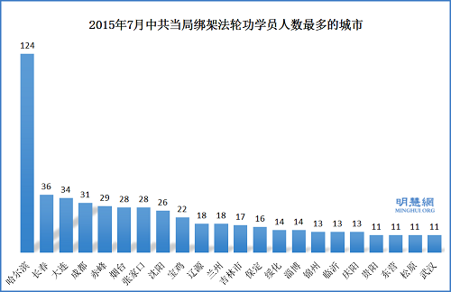【明慧网二零一五年八月二十四日】据明慧网报道所做的统计,7月份,遭绑架的中国大陆法轮功学员1187人, 55人遭非法判刑,126人关洗脑班。7月份遭绑架人数突增,接近1-6月份绑架总人数2539人的一半。