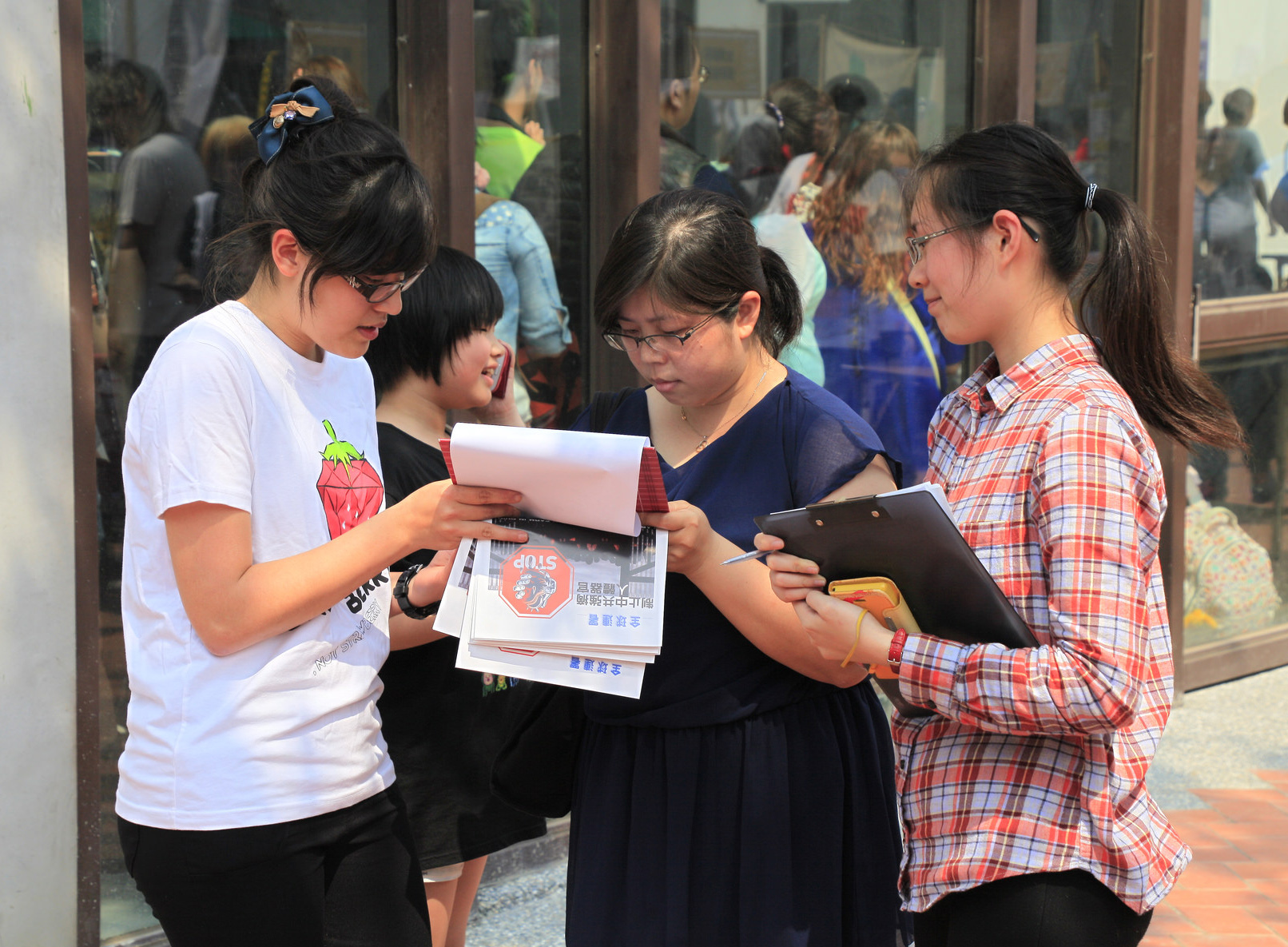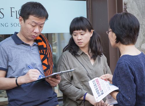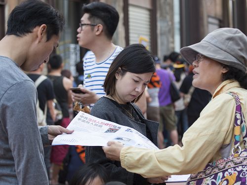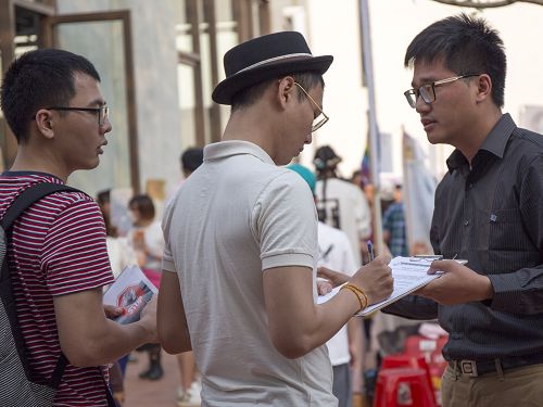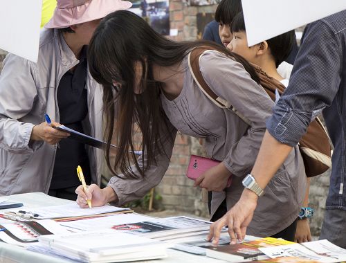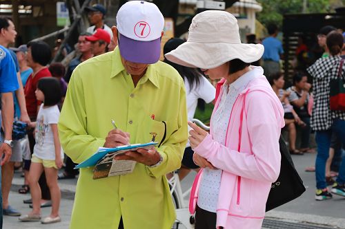 ![]() 图3-9:高雄市法轮功学员设展位向民众征签,制止中共迫害法轮功,民众响应热烈。了解真相的人们纷纷签名,期盼早日将恶人绳之以法。 |