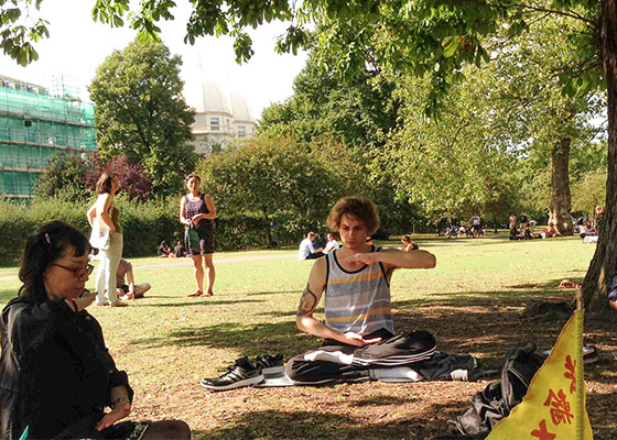 八月二十二日,二十一岁的意大利青年麦克找到了位于伦敦摄政公园的法轮功炼功点,看到了负责义务教功的英国法轮功学员托尼。