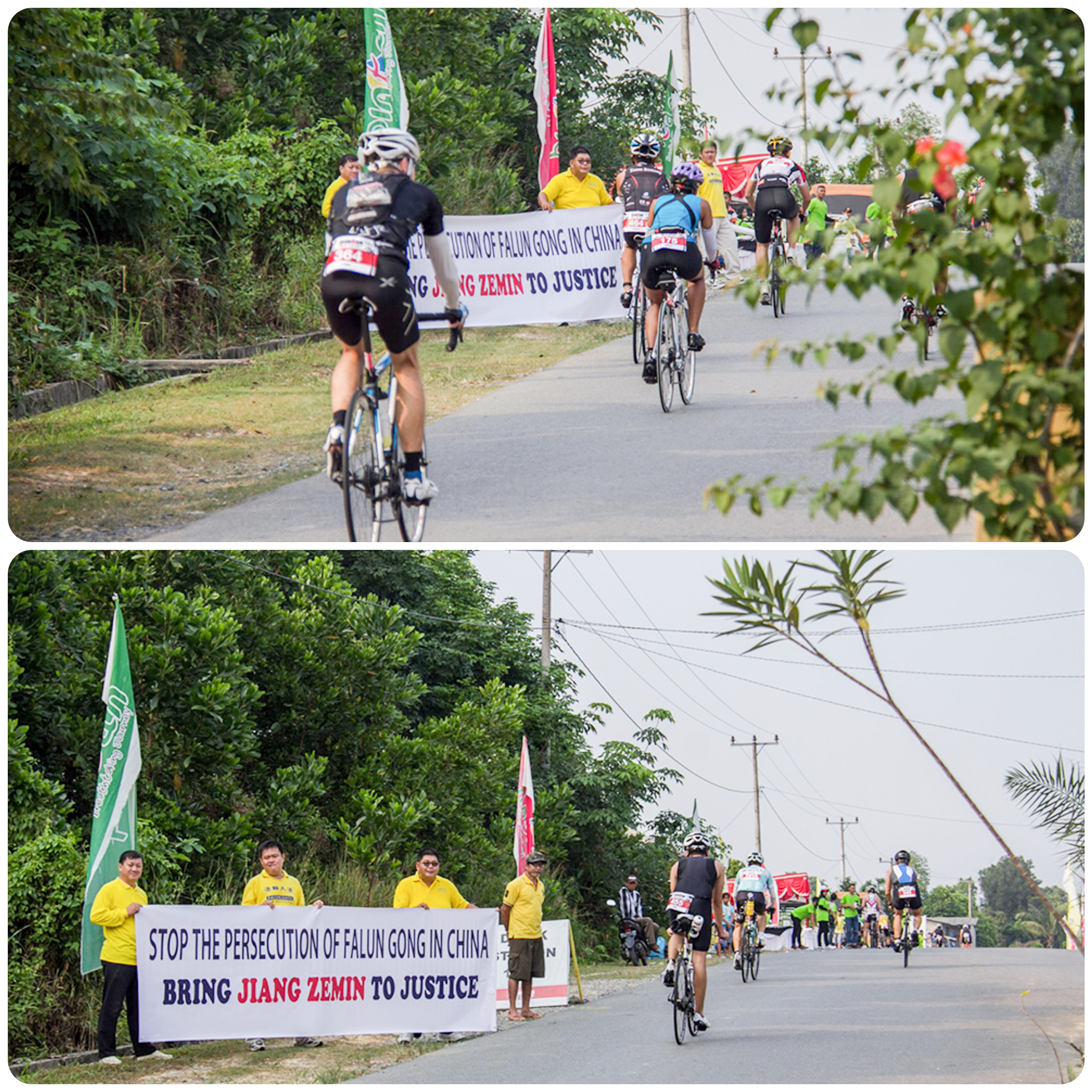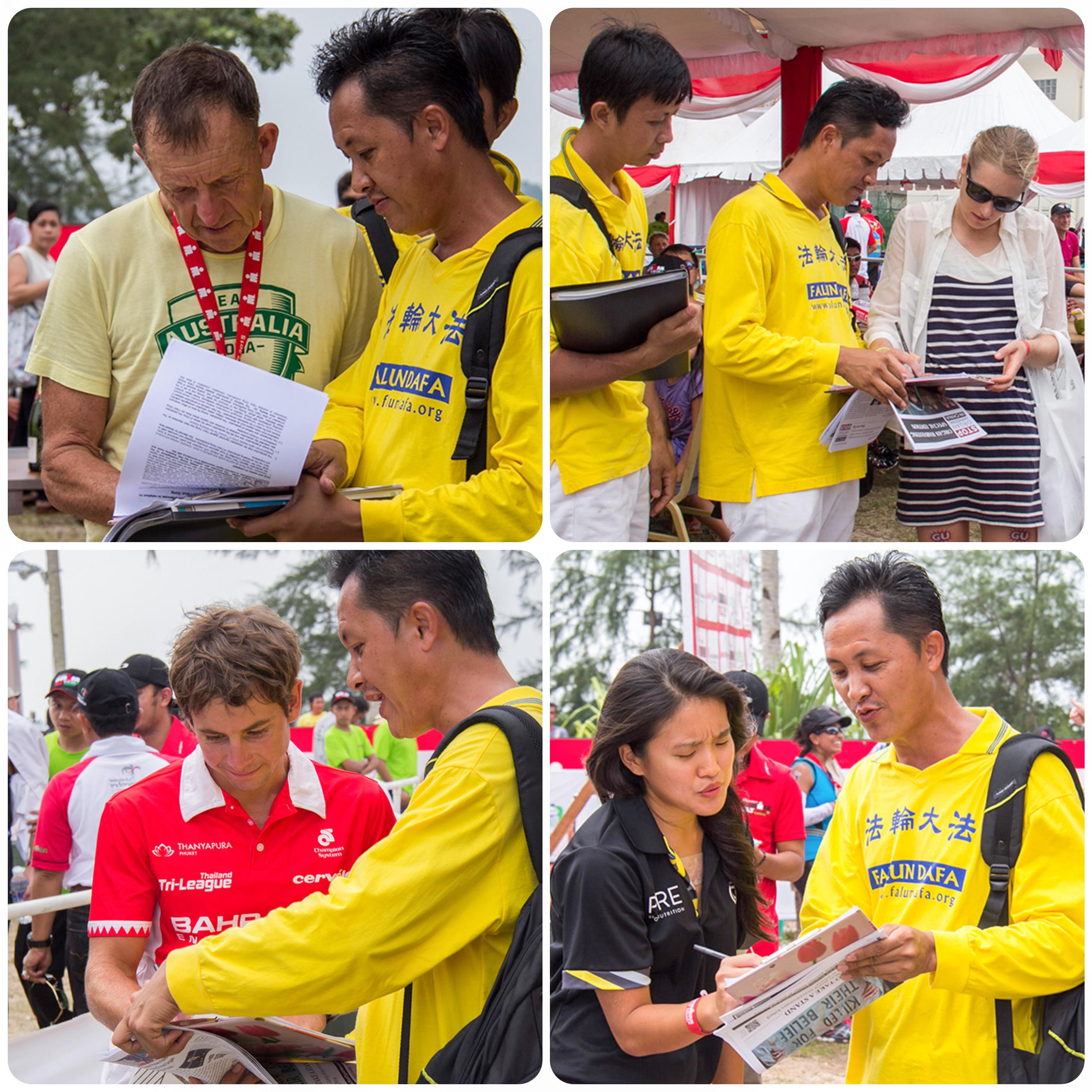 法轮功学员们在拉够易海湾前集体炼功,在比赛经过的主要道路旁展开横幅,还有些学员散发真相传单、讲真相以及收集举报江泽民迫害法轮功的签名。学员们也向在场执勤的警察讲述法轮功真相。