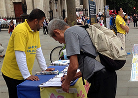 八月二十九日,仍然是游人如织的旅游旺季,英国法轮功学员照例来到位于伦敦市中心旅游热点地带的圣马丁广场开展讲真相活动。