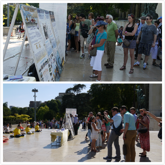 当天,也有很多的中国游客及华人经过。中国游客一改以往的远视和逃避,他们近距离拍摄法轮功学员炼功,用手机拍真相展板的内容,索要《真相报》和《九评》,还有的人在法轮功学员的帮助下,当场退出中共党、团、队。