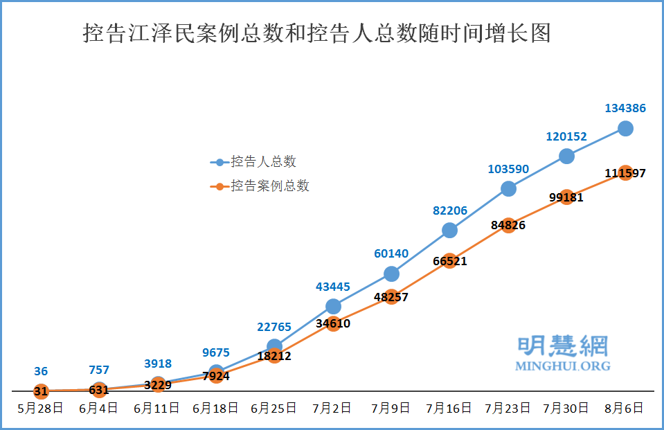 从5月底到8月6日,明慧网已收到总数134386名(111597案例)法轮功学员及家人递交给中国最高检察院、最高法院、公安部等相关部门的诉讼状副本。7月31日至8月6日一周内,超过14234人(12416案例)递交诉状控告江泽民。由于网络封锁和信息传输的不便,实际数字不止于此。