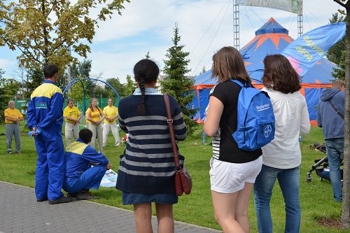 法轮功学员在这两天的时间里向许多来宾介绍了功法,他们还摆出信息展板、印有“真、善、忍”的横幅,教孩子们折叠纸莲花,在公园最繁华的地段炼功并讲解。