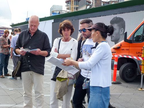 两位欧洲中年女士签名后,还领来两位同事,她们来到征签桌前马上就签名。她们在国际组织“医生反对强摘器官”(DAFOH)的表上也郑重签下名。签名后,她们还询问:“我们还能帮助什么?”学员告诉她们:“把这个真相告诉你们的亲戚朋友,告诉更多的人,你们就是在帮助我们,支持正义,制止罪恶。”