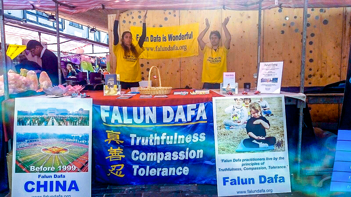 在喧闹繁杂的嘉年华活动场地上,飘出宁静祥和炼功音乐的法轮功展台吸引着人们的目光,很多人放慢脚步、驻足观看功法演示,接过真相传单阅读、与法轮功学员交谈,有些人在谴责中共活摘器官罪行的征签表上签字。