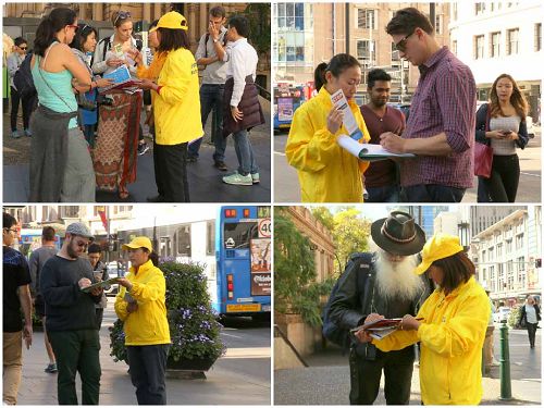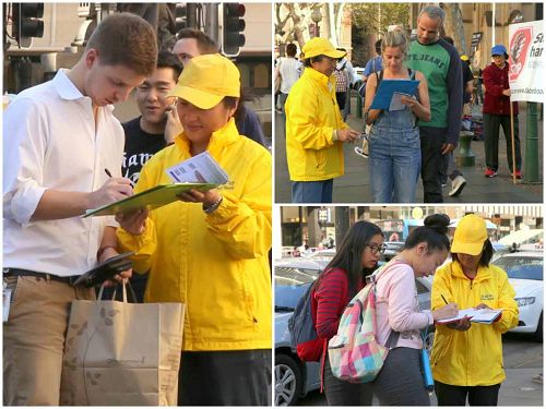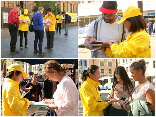 另外,有三名悉尼纽因顿学院(Newington College,独立私校)的学生路经真相点,看到真相横幅,并接了递给他们的真相资料。他们边走边看手中的真相资料,在前面的一位正在征签的法轮功学员跟前停下,一一签了名。他们表示,这种迫害是罪恶的,我们应该签名制止它。