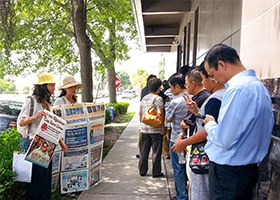在美国休士顿中领馆前,法轮功学员每天都来向申请签证的人们讲述中共对法轮功长达十六年的残酷迫害真相。