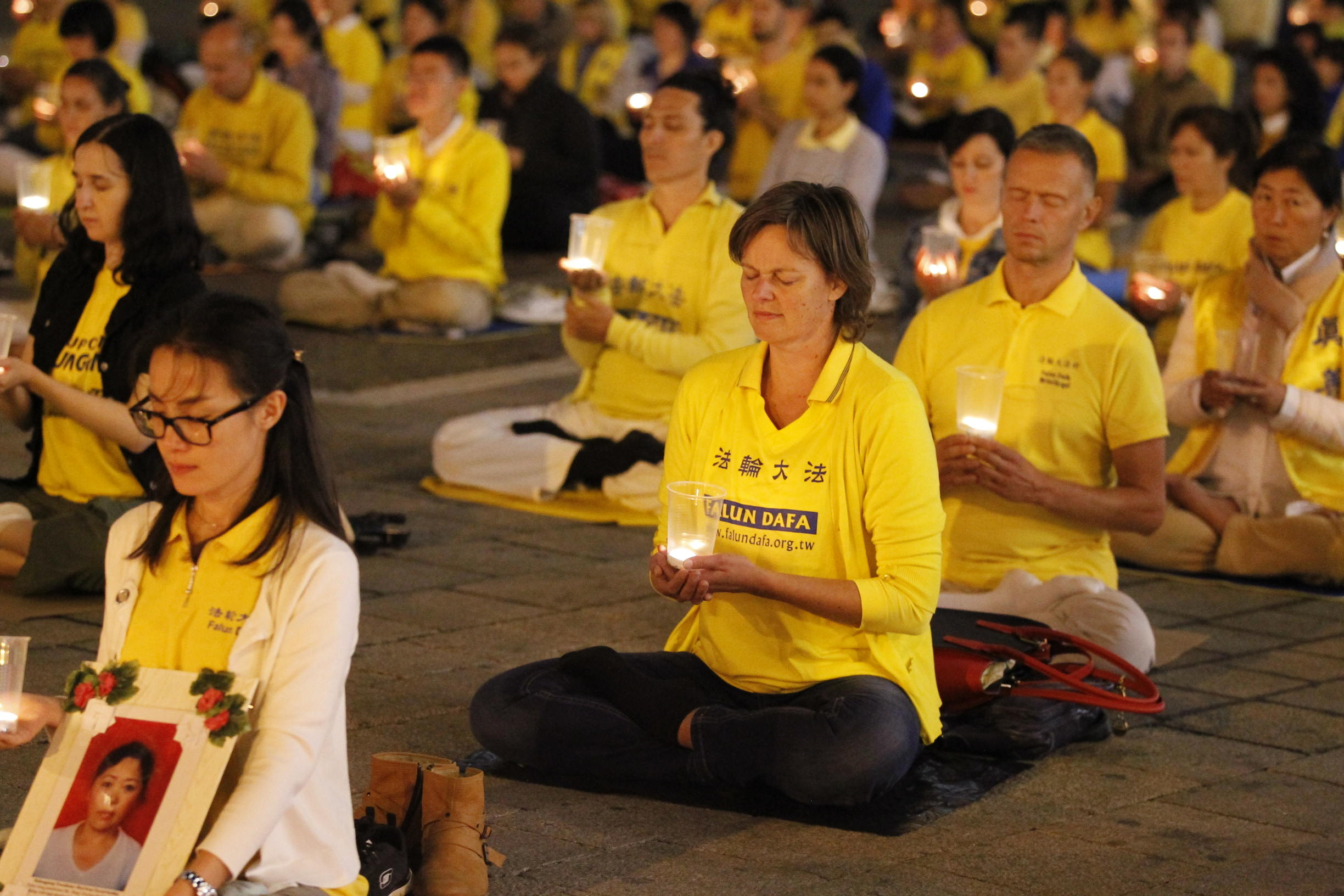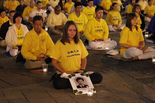 九月十八日晚欧洲法轮功学员在斯蒂芬广场举行集体炼功和烛光守夜声援诉江大潮