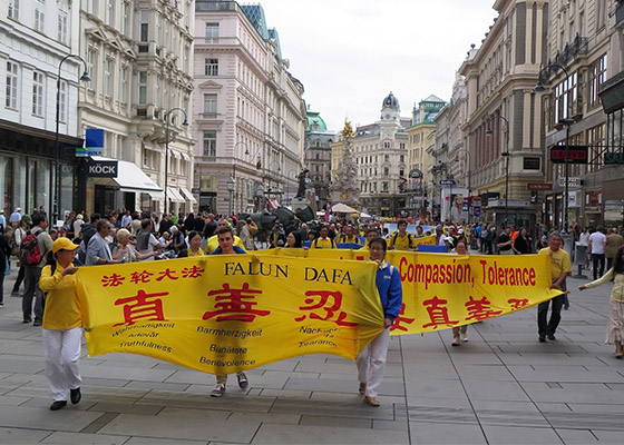 - 欧洲学员维也纳大游行 诉江潮引共鸣- 来自欧洲三十个国家的法轮功学员于九月十九日中午,聚集在奥地利首都维也纳,举行了声援中国大陆法轮功学员的诉江大潮的盛大游行。
