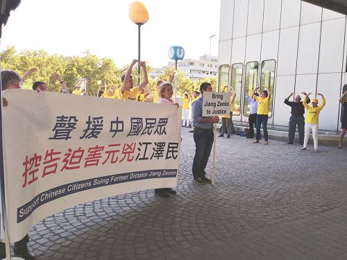 在维也纳联合国大厦外,法轮功学员打出横幅,竖起展板传达重要的真相信息、有人演示法轮功五套功法、有人发放法轮功真相传单并面对面讲真相、有人征签谴责中共活摘法轮功学员器官的罪恶。横幅和展板上用中、德、英文书写的信息是:“世界需要真善忍”、“声援中国民众控告迫害元凶江泽民”、“Bring Jiang Zemin to justice” ,以及向联合国提交的谴责中共活摘器官罪行的三大请愿诉求。