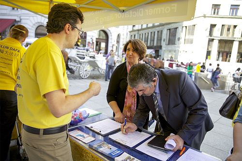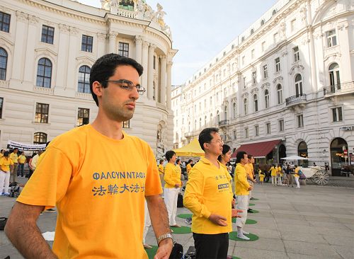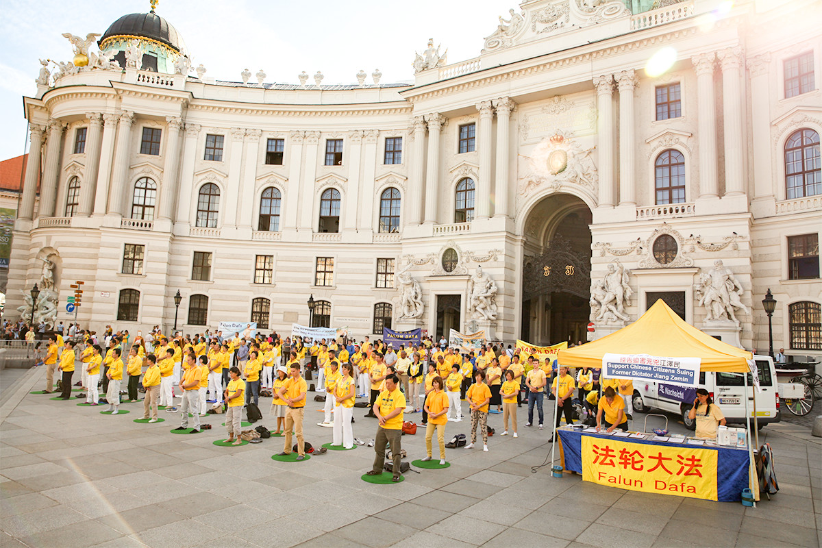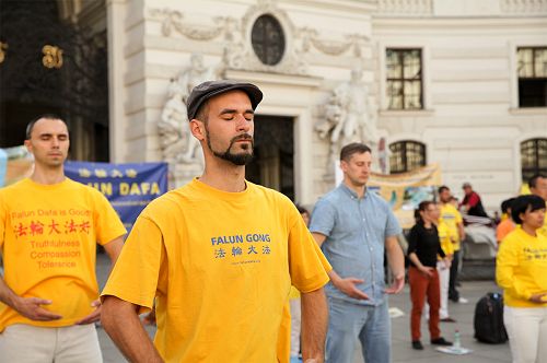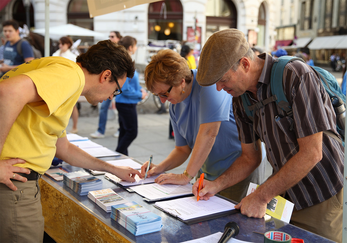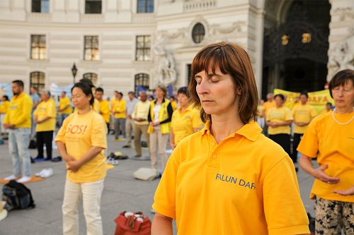 一对穿着非常体面的维也纳夫妇目不转睛地看着法轮功学员炼第四套功法,太太觉得这一定对脊椎非常有好处,因为她自己练瑜伽,能感到很强的能量,他们跟法轮功学员交谈什么是法轮功、为什么江泽民要迫害法轮功,他们接过了法轮功的真相资料,表示要回去好好看看。