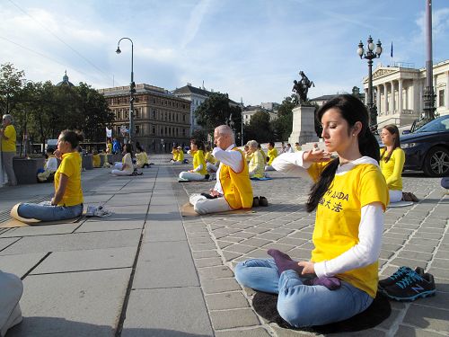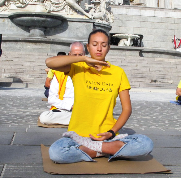 来自保加利亚的法轮功学员波伊安娜(Boiana)参加了在奥地利国会大厦前的集体炼功。她在十四个月前开始修炼法轮功,一年前开始能够双盘,打坐最长时间记录是四十分钟,今天和大家一起炼功不知不觉中打坐了四十五分钟。问她感受,她说:“今天感觉很好、很好。能量场很强,一切都好。”