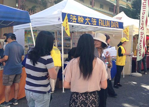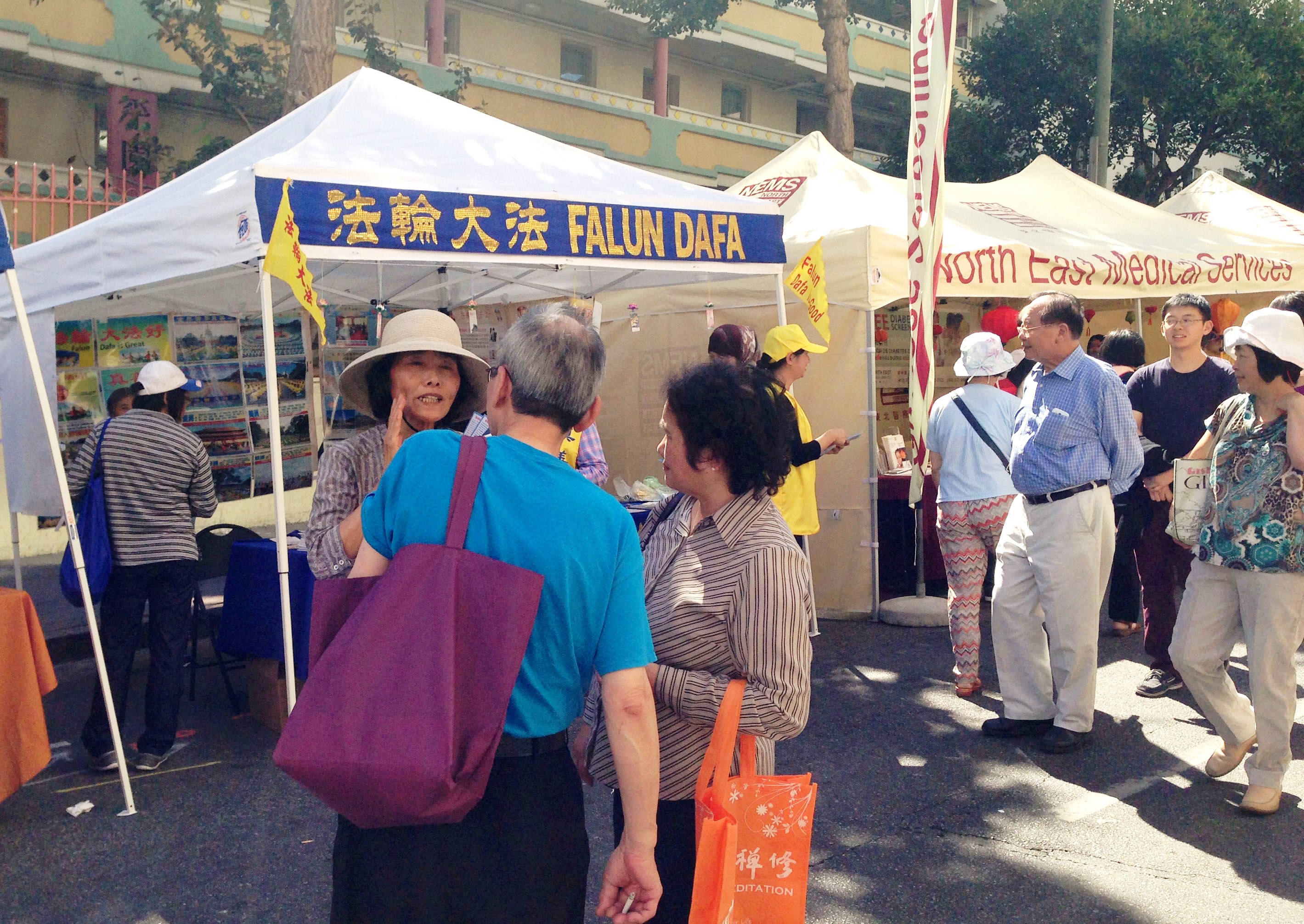 图1:法轮功学员在旧金山中国城中秋街会设立摊位,传播法轮功的真相。