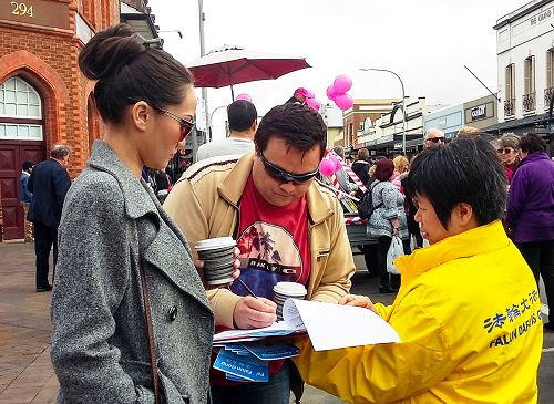 当地市政府议员图尔兰德(Wingecarribee Shire Council councillor Garry Turland)看到正在街上征签的法轮功学员,上前友好地打招呼,并说:法轮功每年都参加宝柔镇的郁金香节游行。他表示了解法轮功在中国受到的迫害,很同情受迫害的法轮功学员。他随后在制止“活摘”和声援“诉江”征签表上签了名。