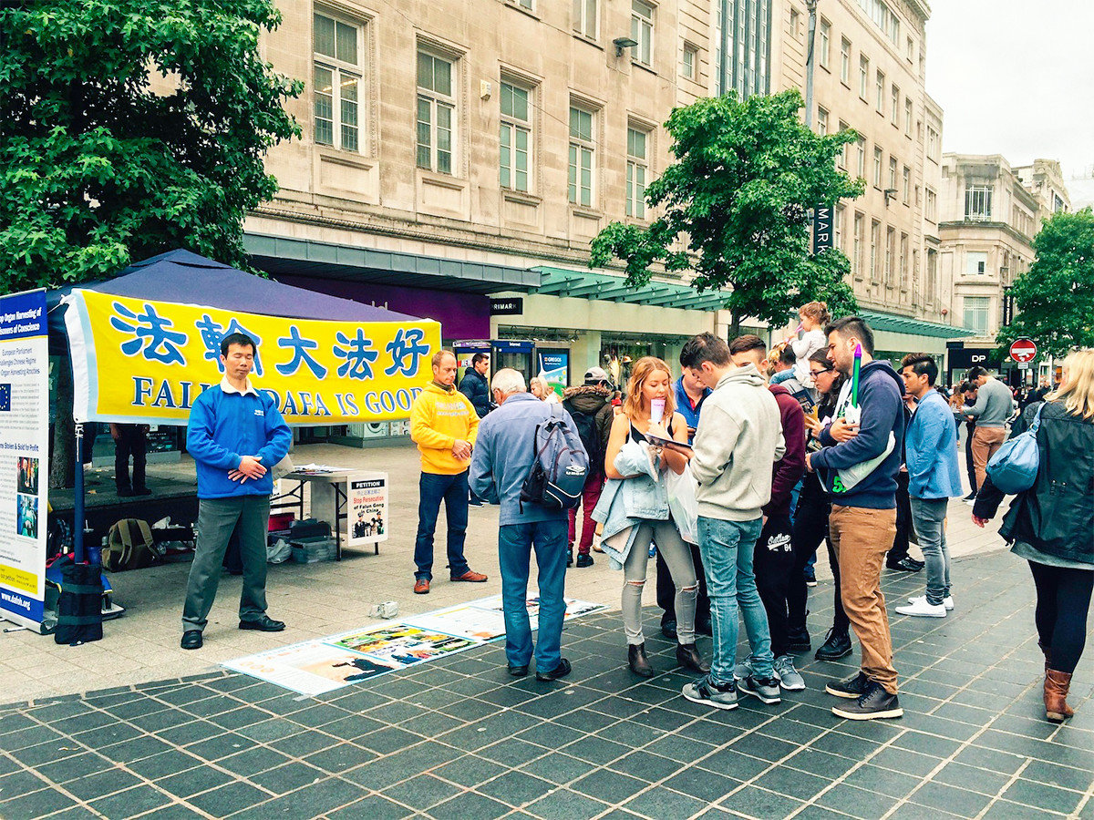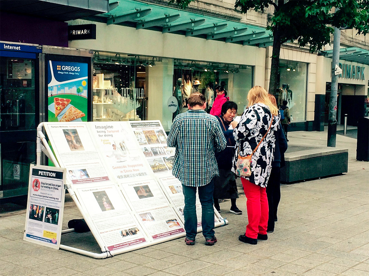 作为一个港口旅游城市,利物浦有很多外地游客,不少来自英国其它地区,或者其他国家的人纷纷在“反对活摘器官”的征签板上签名。