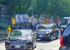 习近平抵达访美首站西雅图,法轮功学员在机场和他入住的酒店的道路两旁,打出“制止迫害法轮功”,“起诉江泽民”等横幅。