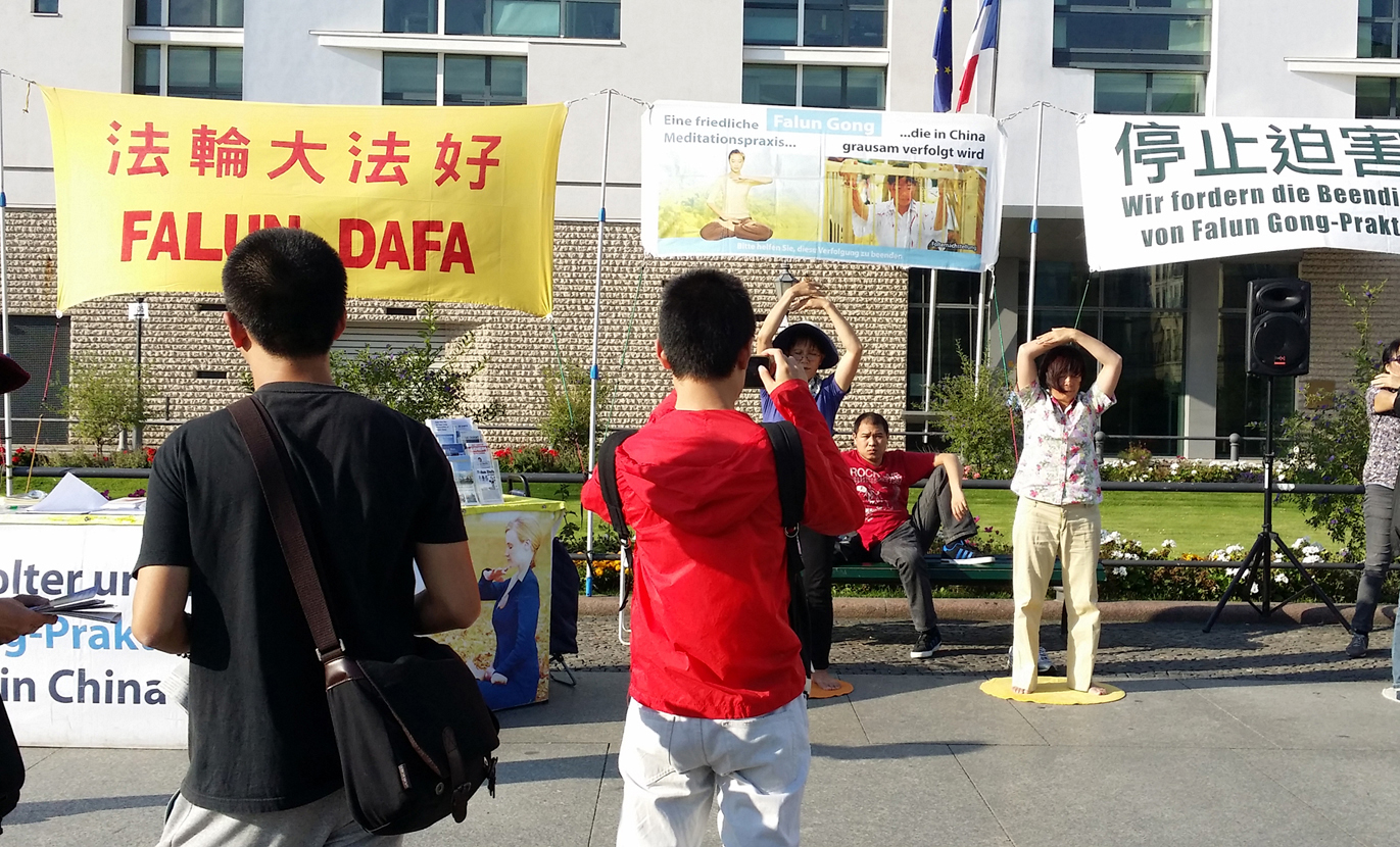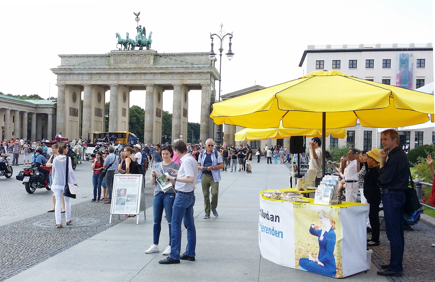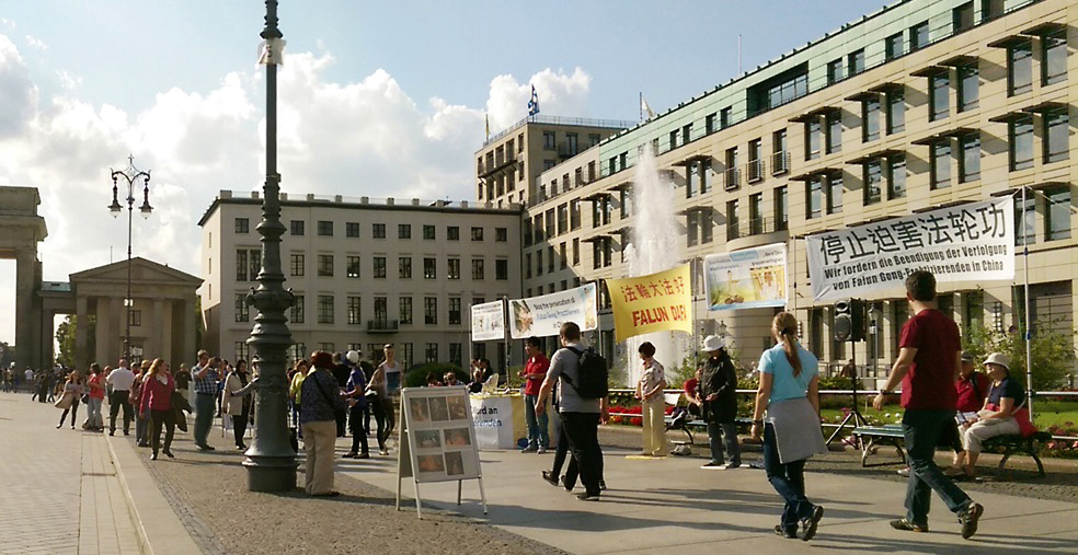 从地铁站出来,从远处即可看到勃兰登堡门前巴黎广场一侧高挂的“法轮大法好”、“停止迫害法轮功”、“制止活摘器官”、“法轮大法——和平的打坐功法在中国被迫害”等横幅。法轮功的横幅、展板和信息台形成了一道独特的风景,吸引着众多的过往行人来了解法轮功的真相。