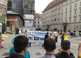 维也纳市中心的斯特凡大教堂前广场,欧洲法轮功学员上演了讲真相街头剧,把法轮功学员十六年反迫害的历史画面回放在人们面前。