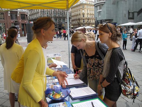 当听说有专门支持法轮功学员诉江大潮的征签表后,很多人表示愿意签名表支持。在上演讲真相街头剧的两个小时里,签名谴责中共迫害和活摘器官罪恶的人数明显增多,这些签名支持的人们包括奥地利人、德国人、荷兰人、瑞典人……