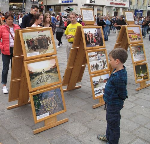 下午一时许,欧洲法轮功学员浩浩荡荡的队伍从斯特凡大教堂前广场出发,开始三个小时的声援中国大陆法轮功学员诉江大潮的盛大游行。与此同时,部分法轮功学员继续在斯特凡大教堂前广场上向广大游人讲真相。法轮功学员的功法展示、发放传单以及摆在一侧的真相信息展板吸引着人们的目光,很多人驻足观看,不断有人走到信息台前进一步了解真相并签名反迫害。