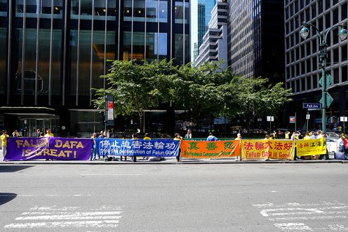 图1-2:二零一五年九月二十五日,纽约部分法轮功学员在联合国总部对面进行了和平请愿,呼吁制止迫害,法办江泽民。