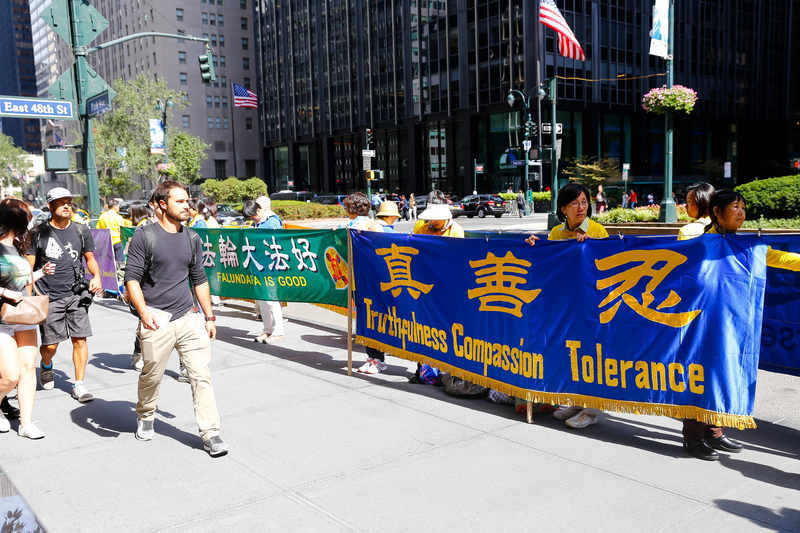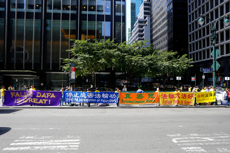 图3-6:二零一五年九月二十五日,纽约部分法轮功学员在习近平将入住的华尔道夫酒店对面和平请愿,法轮功学员展现的祥和理性受到路人的赞许。