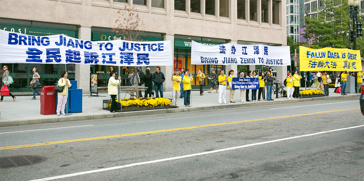 二十四日下午五点到晚十点,来自辽宁省大连市的法轮功学员张慧东拉着“法办江泽民”横幅一角,静静地站了几个小时。他说,在江泽民发动的这场对法轮功的迫害中,他和母亲及两位姐姐被多次非法抓捕、强制洗脑和被强迫劳动。他的父母在迫害中去世,张慧东的身体已被迫害残疾。