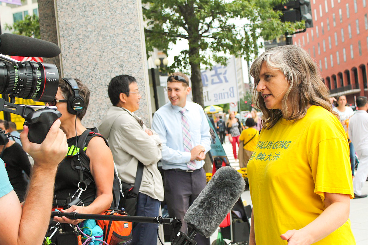 《巴尔的摩太阳报》(Baltimore Sun)两位已退休主编威廉(Larry Williams)和迈尔斯(Marsha Myers)接过法轮功学员手中的真相传单,仔细阅读,并和法轮功学员攀谈。