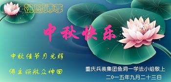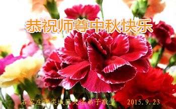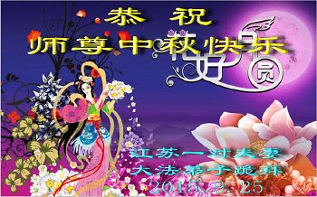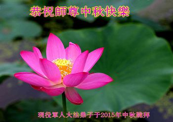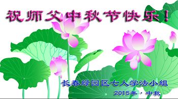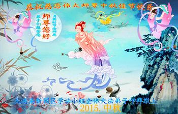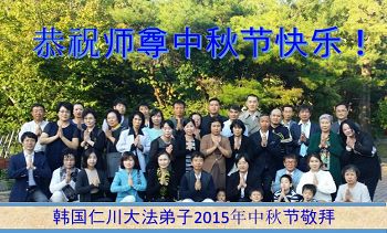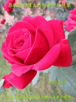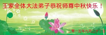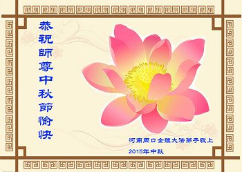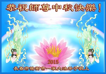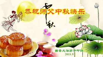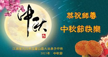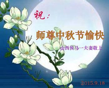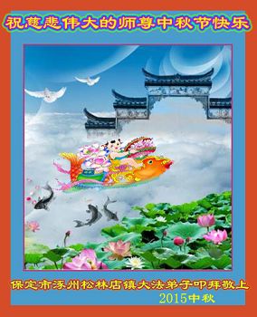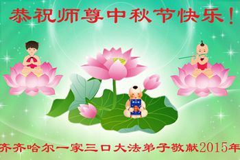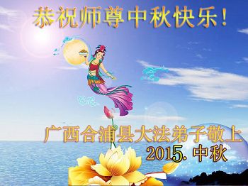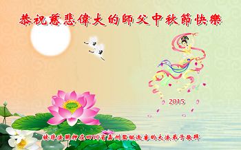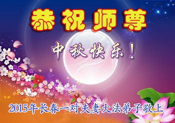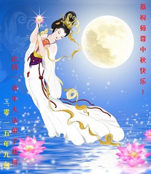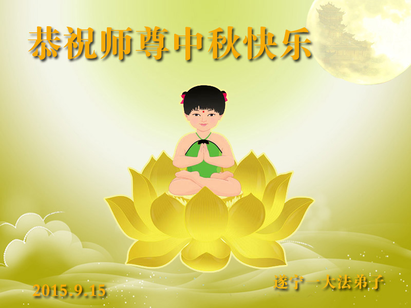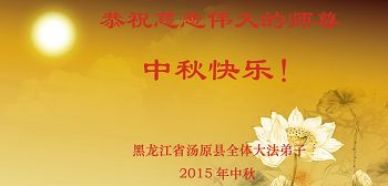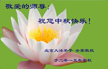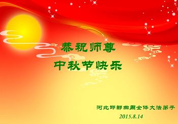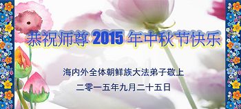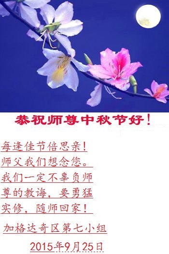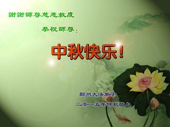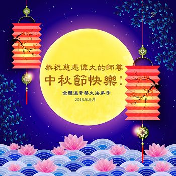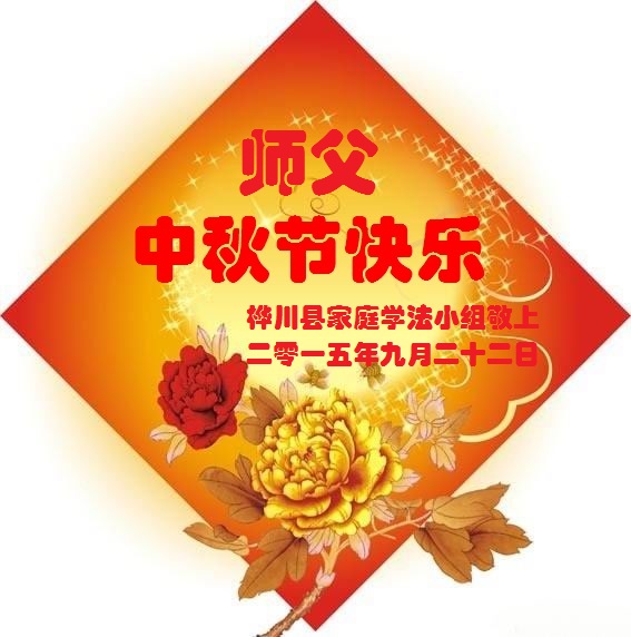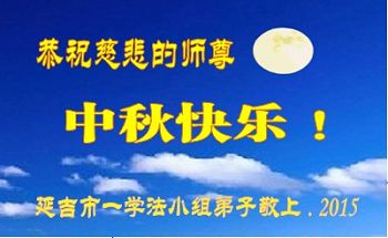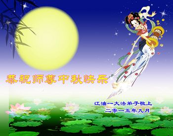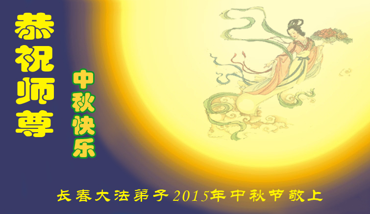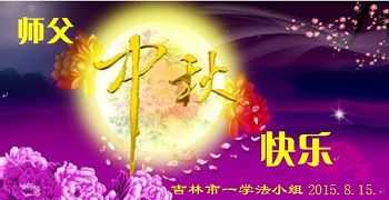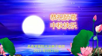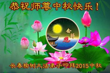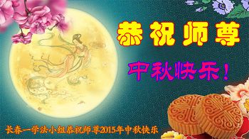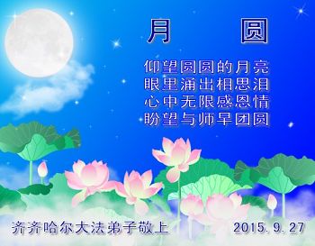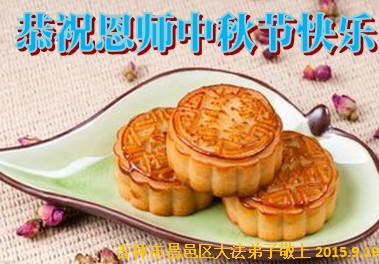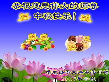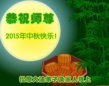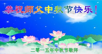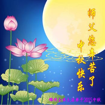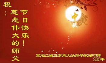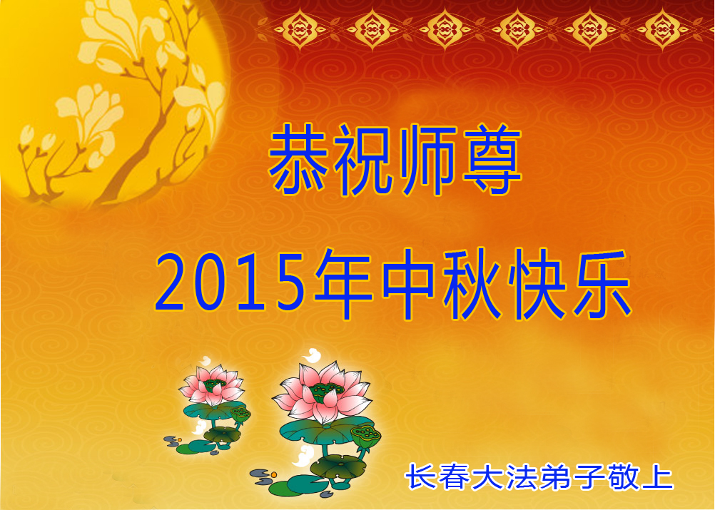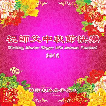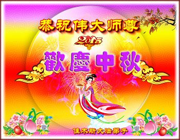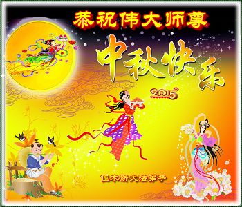 2015年中秋节已到,在合家团圆的节日里,本人恭祝法轮大法创始人李洪志师父节日快乐!支持大法弟子反迫害,起诉江泽民,谴责中共活摘法轮功学员人体器官牟利的反人类暴行。愿法轮大法在全世界发扬光大。