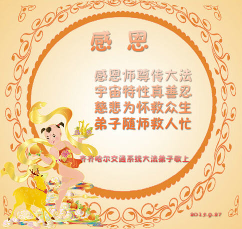 我们沐浴在师尊及大法的洪恩中,身心健康、家庭和睦,其乐融融。佳节倍思亲,我们想念师尊,感恩师尊,祝福师尊!我们要紧跟正法進程,积极参与诉江救人,兑现誓约,走好最后的路,随师返家园。