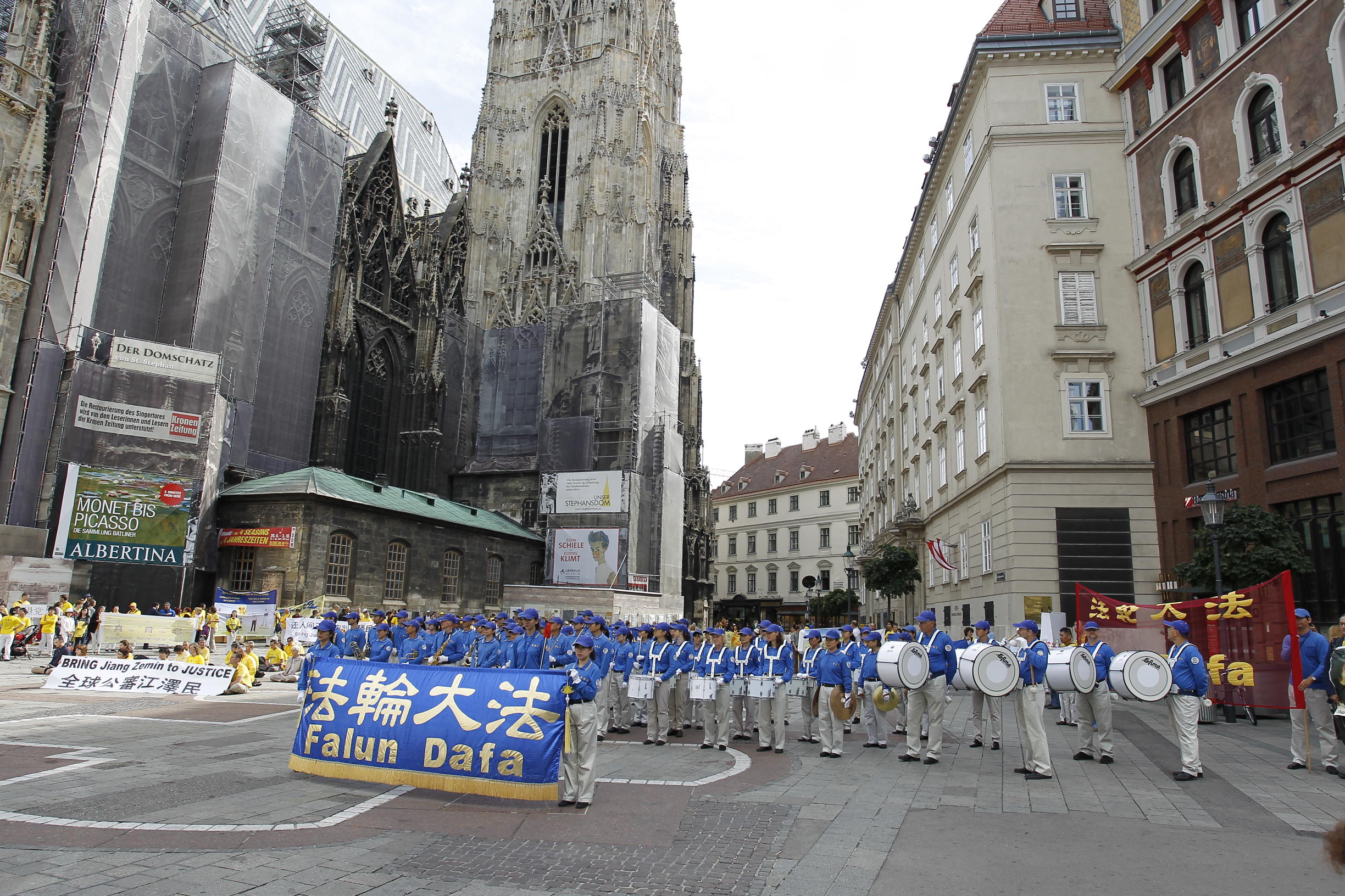 在音乐之都维也纳市中心的维也纳圣斯蒂芬大教堂(St. Stephen's Cathedral, Vienna)广场,二零一五年九月十九日出现一个与众不同的军乐团——天国乐团。他们演奏带着东方韵味的旋律和西方经典乐曲:“法轮大法好”、“法轮圣王”、“法正乾坤”、“法鼓法号震十方”、“送宝”、“欢乐颂”。雄壮而激动人心的旋律,优美流畅的音符吸引众多民众驻足观看、倾听。更奇特的是他们的成员大多是中国人面孔。