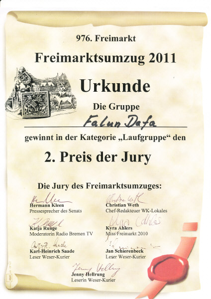 学员说:“在不莱梅,天国乐团经过主席台,主持人说‘法轮’,观众就说:‘大法’。‘法轮’,‘大法’反复很多次,台上台下遥相呼应。”在不莱梅天国乐团被授予第二名的荣誉奖项。
