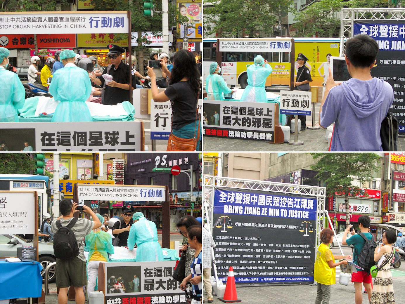【明慧网二零一五年九月二十九日】(明慧记者郑语焉台北市采访报导)台北地区部份法轮功学员于二零一五年九月二十六日,在台北公馆商圈(俗称台大公馆商圈)邻近捷运站的罗斯福路四段,以模拟活摘器官的演示行动剧,揭露中共活摘法轮功学员器官、盗卖牟利的邪恶暴行,向过往行人讲述法轮功真相、传递中国民众控告中共前独裁者江泽民迫害法轮功所犯下“反人类罪”(简称诉江)的讯息,并征集签名,声援诉江,要求中国最高人民检察院和最高人民法院立案侦查,将元凶江泽民绳之以法。