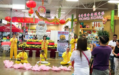 ![]() 图:法轮功学员亚洲时代广场的大厅演示五套功法,吸引各族裔人士驻足 |