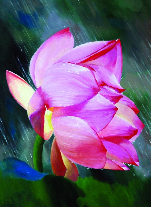 修炼法轮功后,艾欣的绘画技艺进步很大,特别法轮功被迫害后,有段时间,艾欣和同修住在一起,她们早上起来先炼功,之后学一讲《转法轮》,然后她开始画画,从画花过渡到画人物,有时一天就能画一幅,绘画技艺突飞猛进。她画莲花、画红眼石狮、画法轮功学员晨炼、学法等,还有的是洪扬传统文化,有的借画喻志,表达自己坚定修炼的意志。
