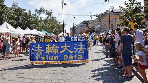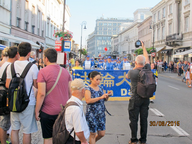 法轮大法游行队伍所到之处受到波兰民众赞叹和欢迎,特别是天国乐团的演奏震撼和洗涤着人们的心灵,相机、手机和掌声一直伴随着游行队伍的始末。天国乐团带给波兰民众的乐曲有《法轮圣王》、《法轮大法好》、《送宝》、《法正乾坤》、《凯旋》等等,很多人随着鼓声响起,笑容自然从心中流淌出来,还有很多人追着法轮功学员只为要一份法轮功真相传单,更多的人惊赞:法轮大法军乐团太棒了!
