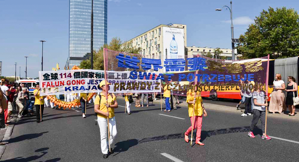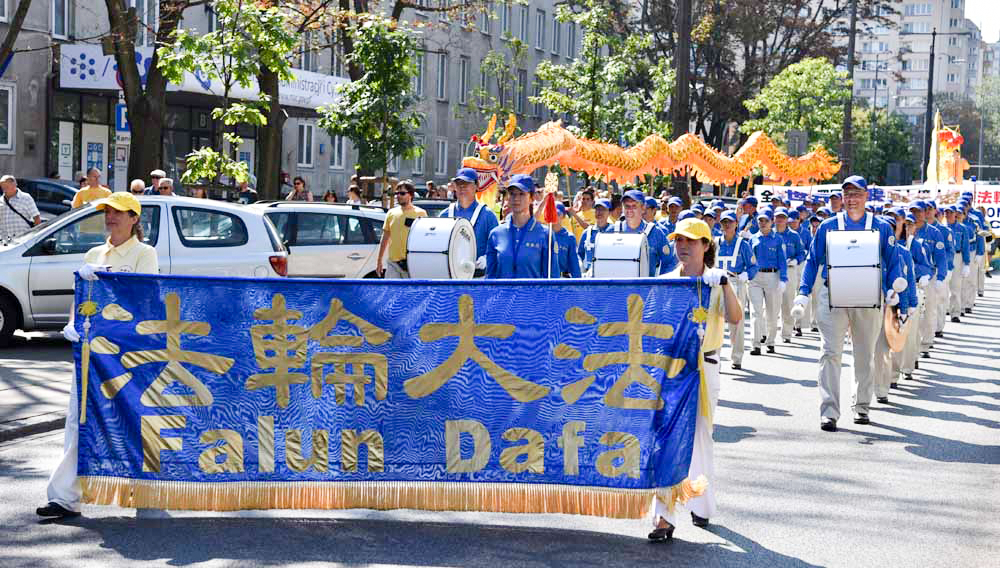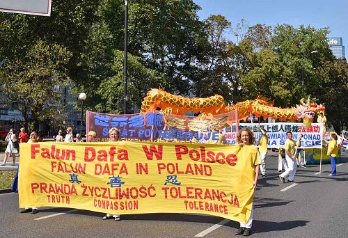 今年专程前来参加华沙多元文化节的还有来自欧洲的天国乐团,他们构成法轮大法游行的第一方队,第二方队是波兰法轮功学员组成的舞龙队,第三方队是一只带有“真善忍”风帆的彩船及手持“法轮大法在波兰”及“世界需要真善忍”等条幅的法轮功队伍。
