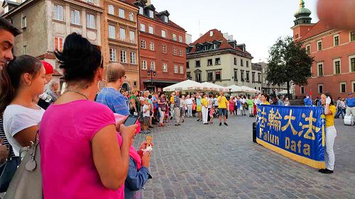 当天国乐团来到老城皇宫门前广场时,众多观众翘首企盼,乐曲奏了一曲又一曲,掌声也鼓过一遍又一遍,有五十多名观众从头看到尾都在现场观看,直到最后人们还在问:还演吗?还演吗?法轮功学员告诉他们明天是华沙多元文化节,在那里可以看到天国乐团的演出,大家才拿着法轮功传单不舍的离开。