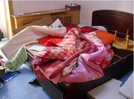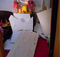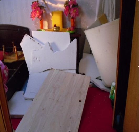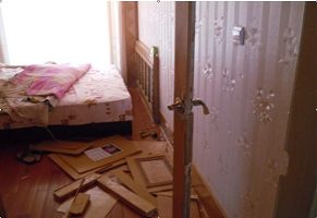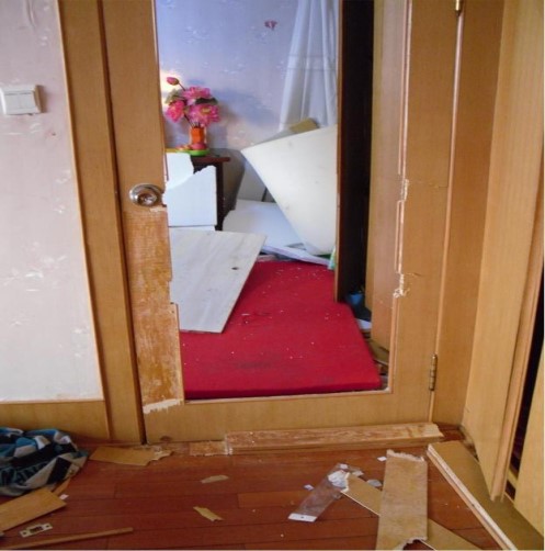 二零零九年十二月二十二日晨,东港市公安局刑侦大队姜龙文和丹东市公安局国保支队杜国军与其它派出所的恶警,合计十几人闯入法轮功学员张伟家,将张伟家三个卧室的门全给砸碎,屋内的家具给砸坏,其它物品也给砸的七零八碎。(见以下四图)