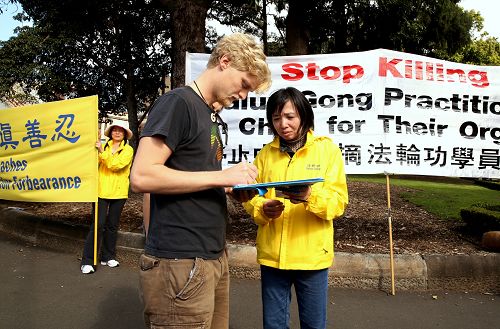 一位男青年接过了真相传单,说这是他第一次听到有关法轮功被迫害的事情。了解到中国大陆众多法轮功学员被中共活体摘取器官牟利时,他震惊不已,说这是他听到过的最恐怖的事情。他立刻在声援起诉江泽民的征签表上签了名。临走他拍着法轮功学员的肩膀说,“你们在这里做这些事情很有勇气,好样的,祝你们成功。”