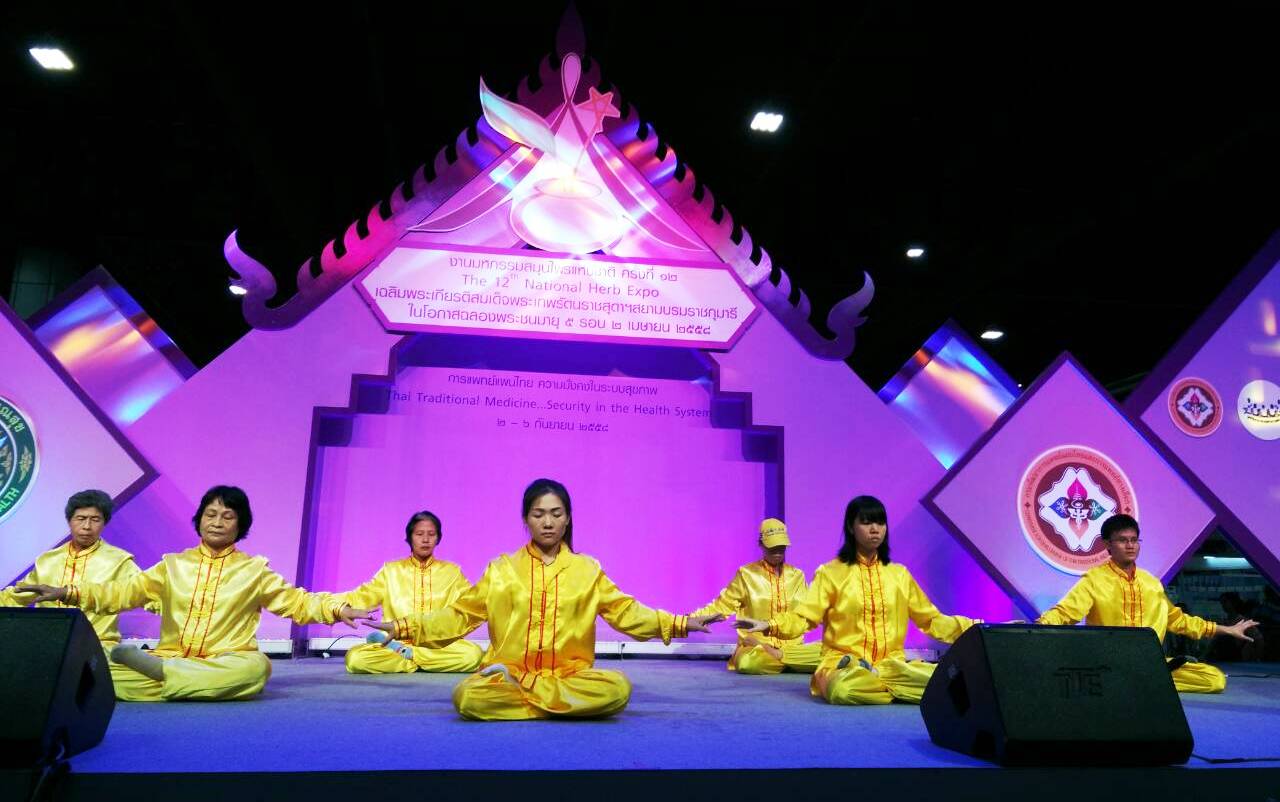 图1:泰国中药博览会上,法轮功学员登台表演功法