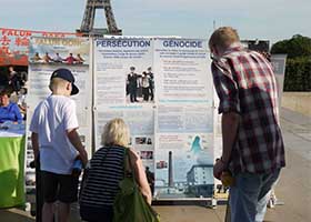 - 艾菲尔铁塔下 游人签名声援诉江大潮(图)- 九月七日下午,部分法国法轮功学员来到艾菲尔铁塔下的人权广场,举行了集体炼功、讲真相的活动,同时声援起诉元凶江泽民。