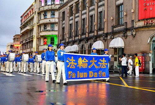 二零零八年的游行中,下起了大雨,其它的游行队伍纷纷躲雨,场面变得零零落落的,然而数百人的法轮大法队伍,齐刷刷地在雨中展示功法,优美的功法乐音与庄严的场面,让现场民众难忘那一幕,心中也铭记法轮大法好!真善忍好!那一年,法轮大法队伍获基隆市政府颁发的最佳团体精神奖与优等奖。二零零九年到二零一二年,还有二零一四年,法轮大法队伍都获得最佳团体精神奖、甲等奖。二零一三年,法轮功学员没参加游行,许多民众遇到学员,一直关心地问,怎么没看到你们呢?