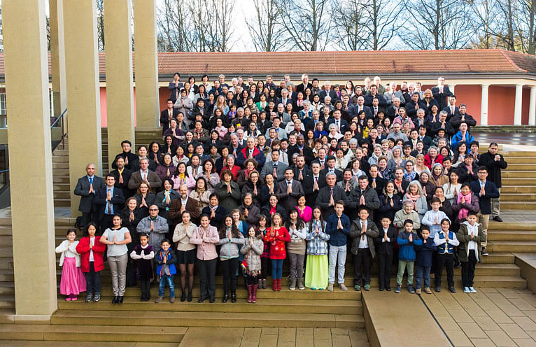 ![]() 二零一六年一月十日德国法会开始之前,与会者在晨光中炼功的场面之一 |