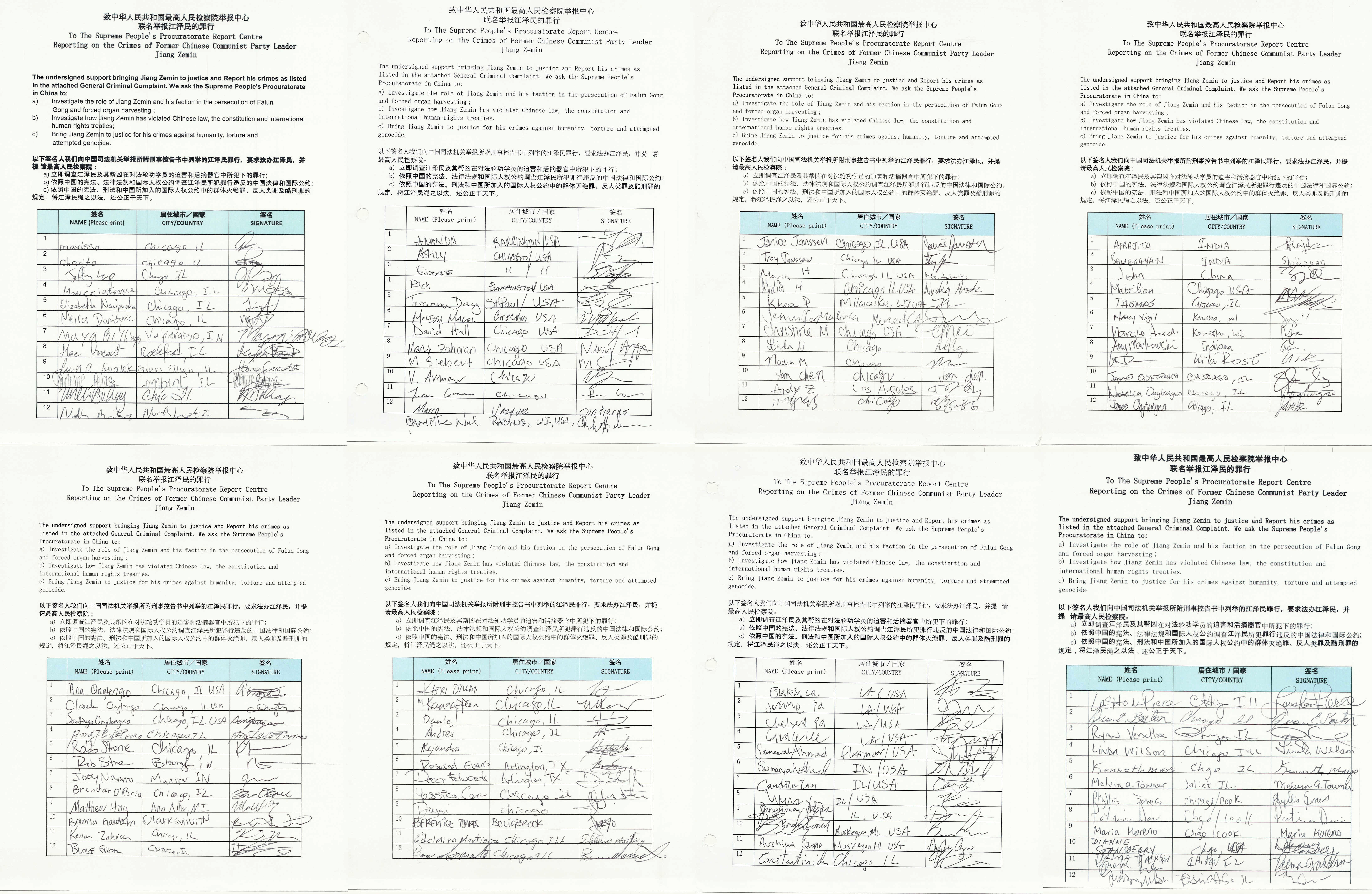 【明慧网二零一六年一月十四日】自二零一五年十月起,美国芝加哥市民众开始签名举报江泽民发起迫害法轮功的骇人罪行。日前,满载着近四千签名的举报信已于一月三日十七时,被最高检察院签收。