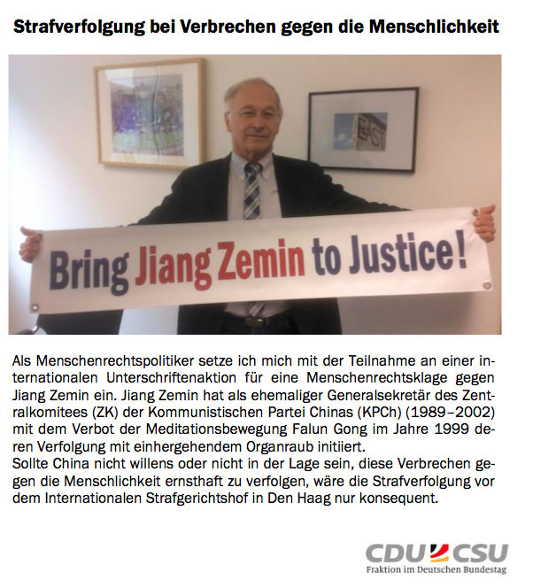 明慧网二零一五年十二月十一日报道,二零一五年十二月十日世界人权日之际,来自德国等国家的不同党派的欧洲政要手举“法办江泽民!”的横幅,共同要求中共当局按照中国国内法律以及国际刑事法的规定,法办迫害法轮功的元凶江泽民。他们强烈谴责自一九九九年以来中共对法轮功学员的系统性迫害。