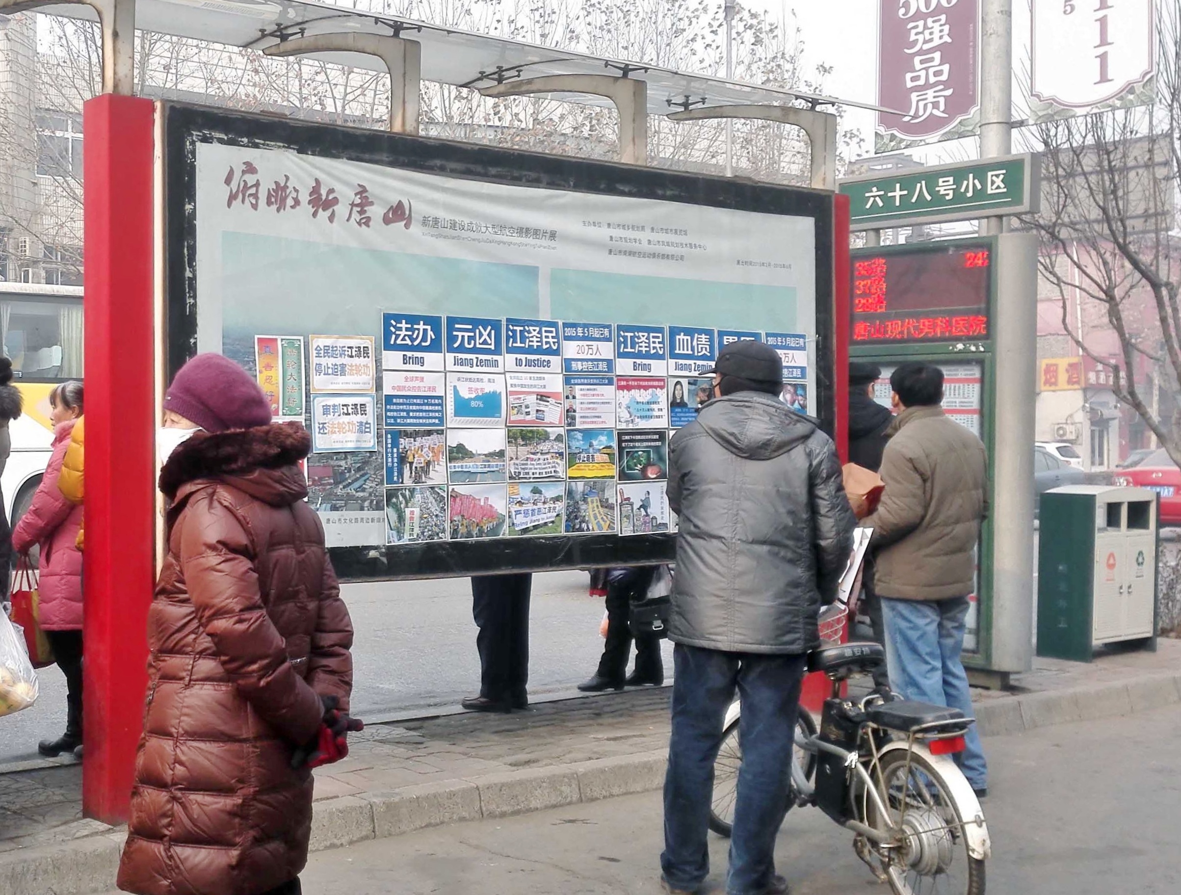 山东省烟台地区的许多街道、公交站点、商棚、居民小区、市郊围栏,等多处出现诉江展板。